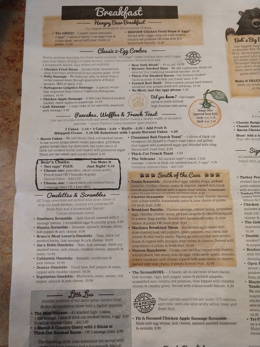 At Black Bear Diner, the menu is a delightful exploration of comfort food, featuring iconic dishes that satisfy any craving. One standout is the Bob's Big Bear Burger, boasting a hefty 10 oz. beef patty seasoned to perfection and topped with luscious grilled onions, fresh tomatoes, and a mouthwatering mixture of flavors including mayonnaise and Thousand Island dressing. For those craving something more decadent, the California Burger presents a delightful option with its golden brioche bun and carefully layered ingredients.